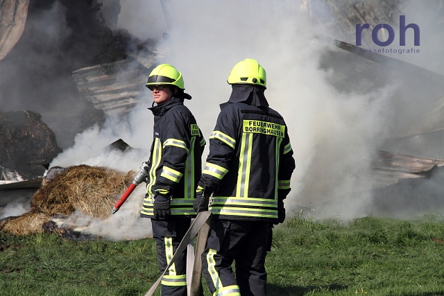 Um 15:04 wurde die Feuerwehr Damme zu einem Brand einer landwirtschaftlichen Lagerhalle an der Hufeisenstraße in Reselage alarmiert. Noch auf der Anfahrt wurde vom Einsatzleiter auf Feuer 3 erhöht und die Feuerwehren Borringhausen und Osterfeine nachalarmiert. Beim Eintreffen der ersten Kräfte brannten in der Halle gelagerte Stroh-Rundballen in voller Ausdehnung und hatten schon auf das Gebäude übergegriffen. Daraufhin wurde umgehend auf “Feuer 4″ erhöht und die Feuerwehren aus Steinfeld, Neuenkirchen, Vörden und der ELW 2 Container des Landkreises Vechta alarmiert. Mit mehreren Trupps von außen, sowie aus der Drehleiter heraus wurde das Feuer bekämpft.